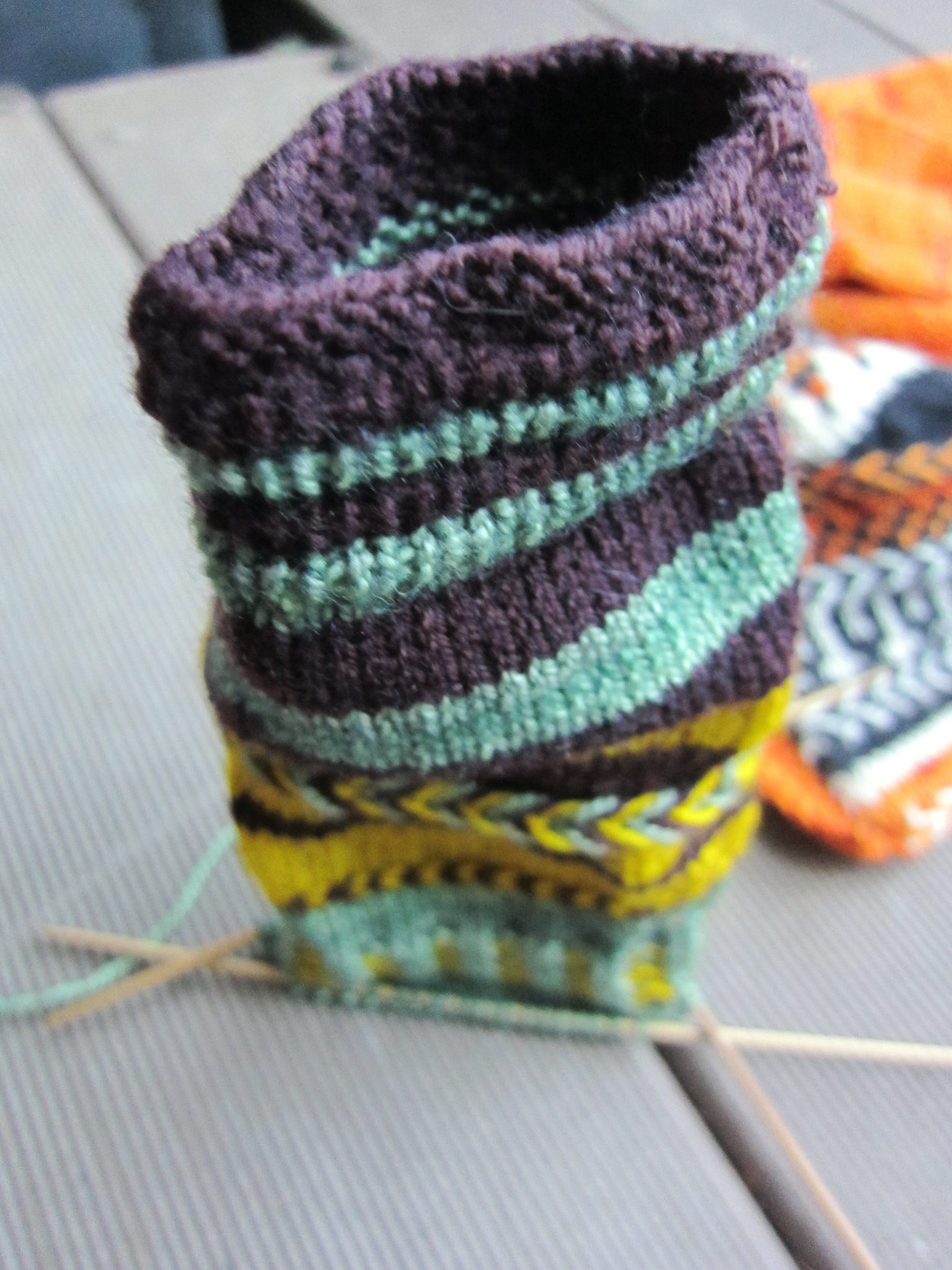I was hoping this swatch, in which I’m experimenting with different striping and textural techniques, could become one of a set of fingerless mitts. Turns out the welts (the textured part at the beginning of the tube) make it VERY difficult to pull on, even though the regular striped Stockinette stitch portions are perfect. That’s why this is a SWATCH. It taught me what I wanted to know about using welts as a design element.