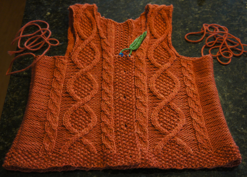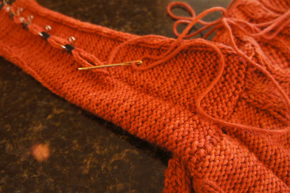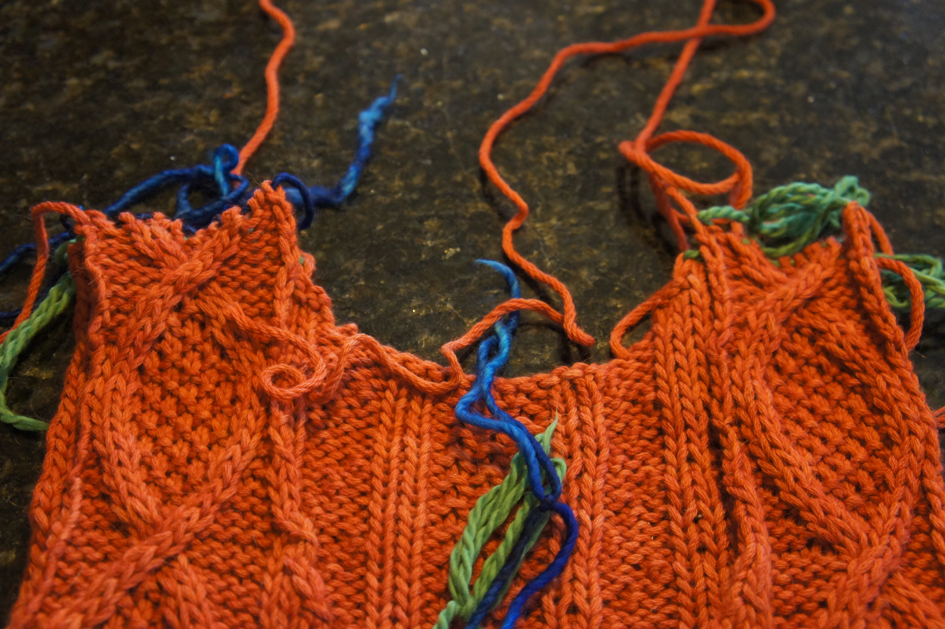 Great! It’s really coming together now! Next up is the trickiest part, in my opinion… Setting in the sleeves. You have 2 pieces of flat knitting that somehow need to fit in to your armholes (notice my long tails of yarn):