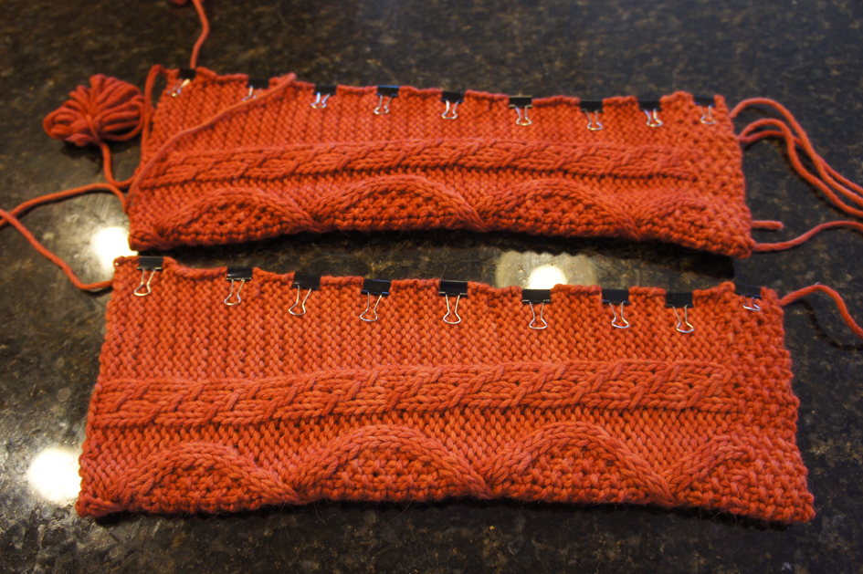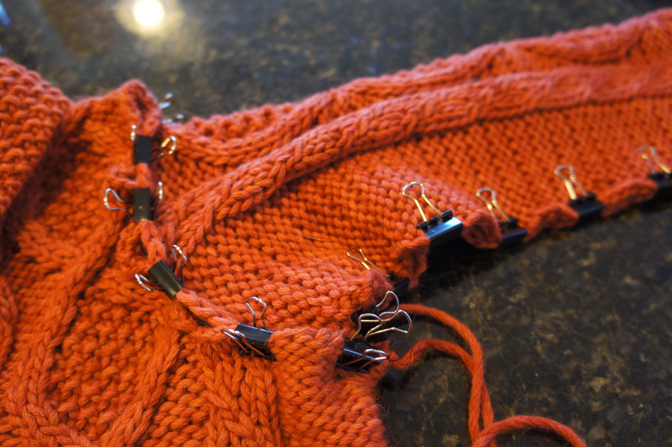 A coworker at Vogue Knitting showed me this trick when I worked there. I would always end up with wonky sleeves with one side overextending the other. I’d have to undo all that seaming, take the whole sleeve out and would get very frustrated. “Binder clips will solve this?” you ask? YES! Ingenious and simple and if you do it this way, you’ll always ensure an evenly set in sleeve. Use the binder clips to form a sleeve with your knitted pieces: