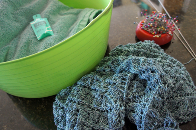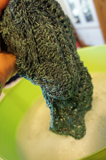 When your timer goes off and it’s time to remove your shawl from the water, you want to be very careful not to wring out or twist your wet knitting. Doing that can pull your stitches and make them all wonky. I squeeze the excess water out by kneading it like bread dough.