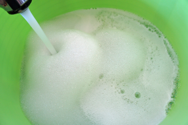 You want to use a basin that is super clean and has no cleaning residue (like the bucket you use to clean the floor with would). For smaller items, you can even use a clean cooking pot, or clean your sink and use that (just rinse it well to get the cleanser residue off). Fill it with COLD water and add a wool wash, such as Soak. Do not use Woolite, dish washing liquid or baby shampoo. These can rip the colors from your yarn, especially if it’s hand dyed. Cold water is very important because warm or hot water can felt your yarn if it’s an animal fiber (wool, yak, camel, angora, etc).
