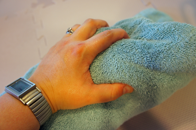 Wrap it up in a big bath towel and squeeze even more water out. Some people like to stand on it, but using your forearms and hands to squeeze it is fine.