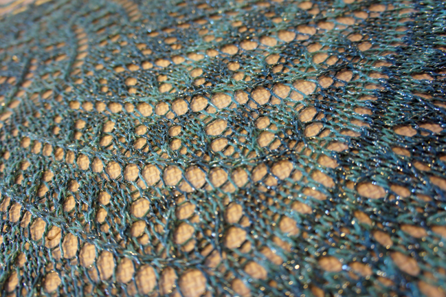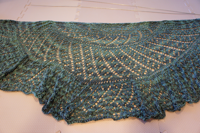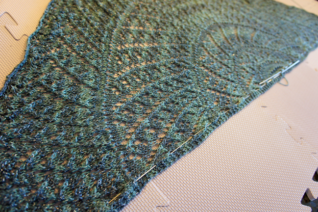 Take it out of the towel and lay it flat on your blocking board or floor. Depending on the fiber you’ve used, your shawl may have almost doubled in size! I used a rayon metallic here, so mine won’t grow too much. Keep in mind that if you’re blocking on your floor, do it in a place where no animals, children or significant others may disturb it. If you’re blocking on the floor, be sure to lay a towel down because yarn can bleed.
