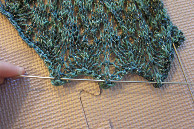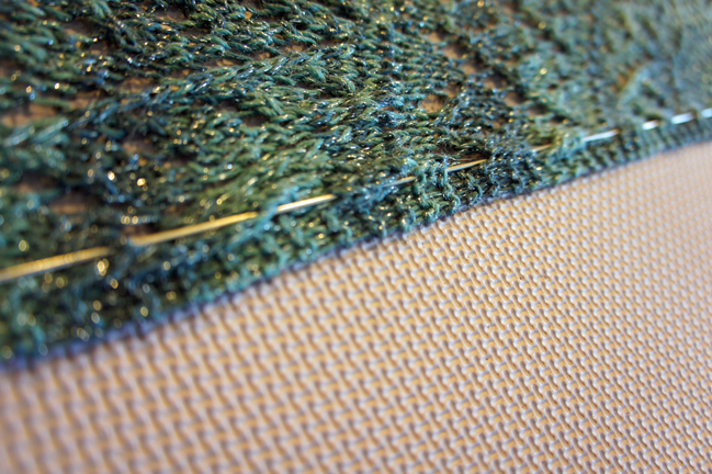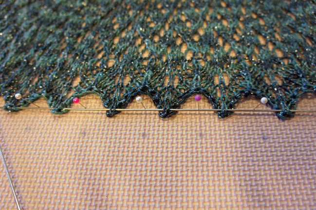 This is the fun part! Grab your wires and pins. You want to weave your blocking wires through the top edge. Most of the time (not always the case!) the top edge of your triangle shawl will be a flat line. You’ll weave the wires through the yarn overs as evenlly as possible across the top. I almost always need 2 or 3 wires to get across the entire top edge. It’s fine to have them overlap and better to overlap than have stitches fly off the ends.