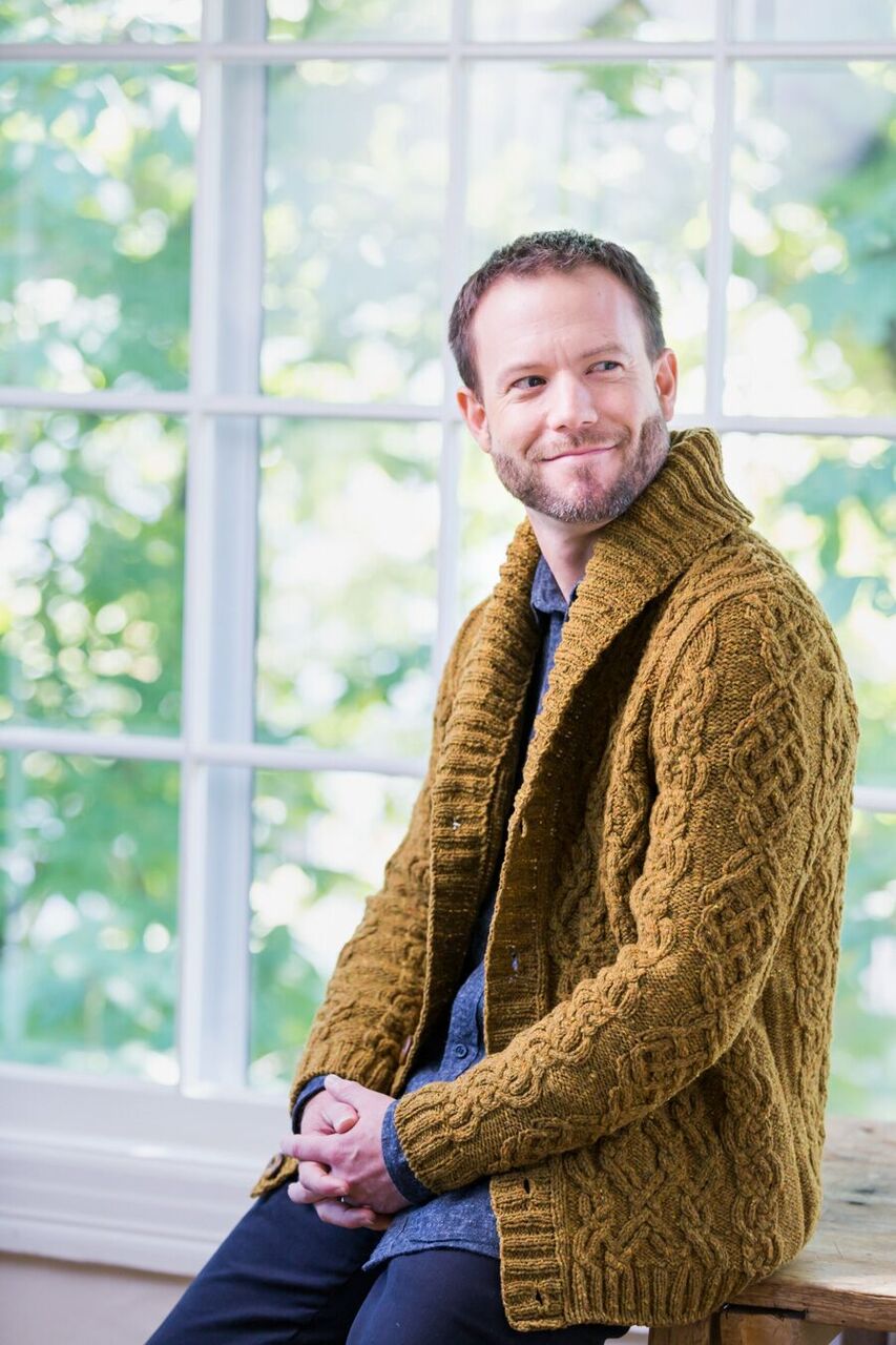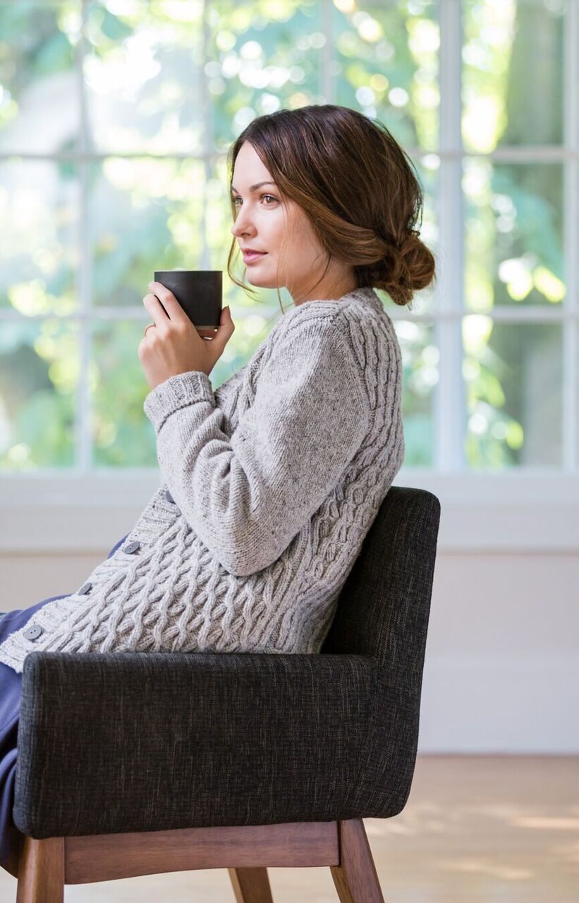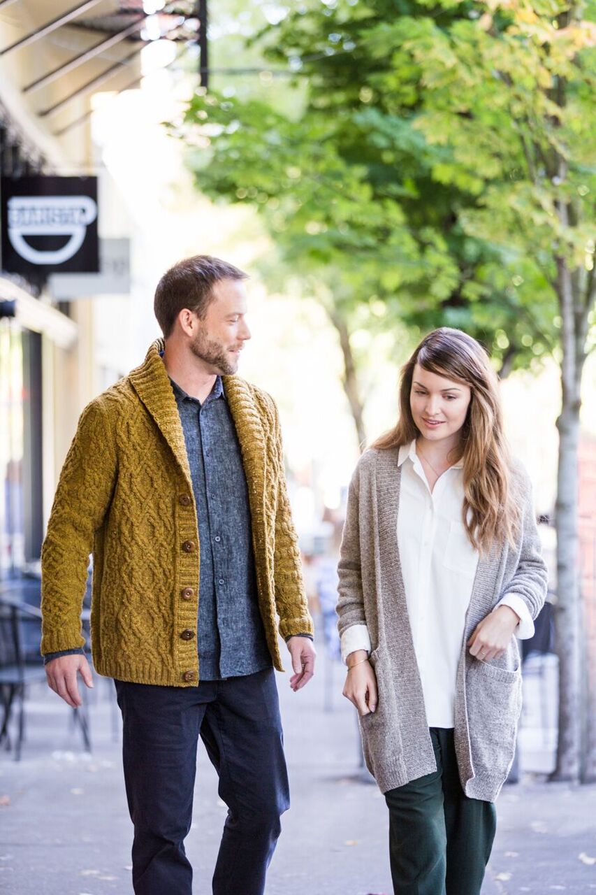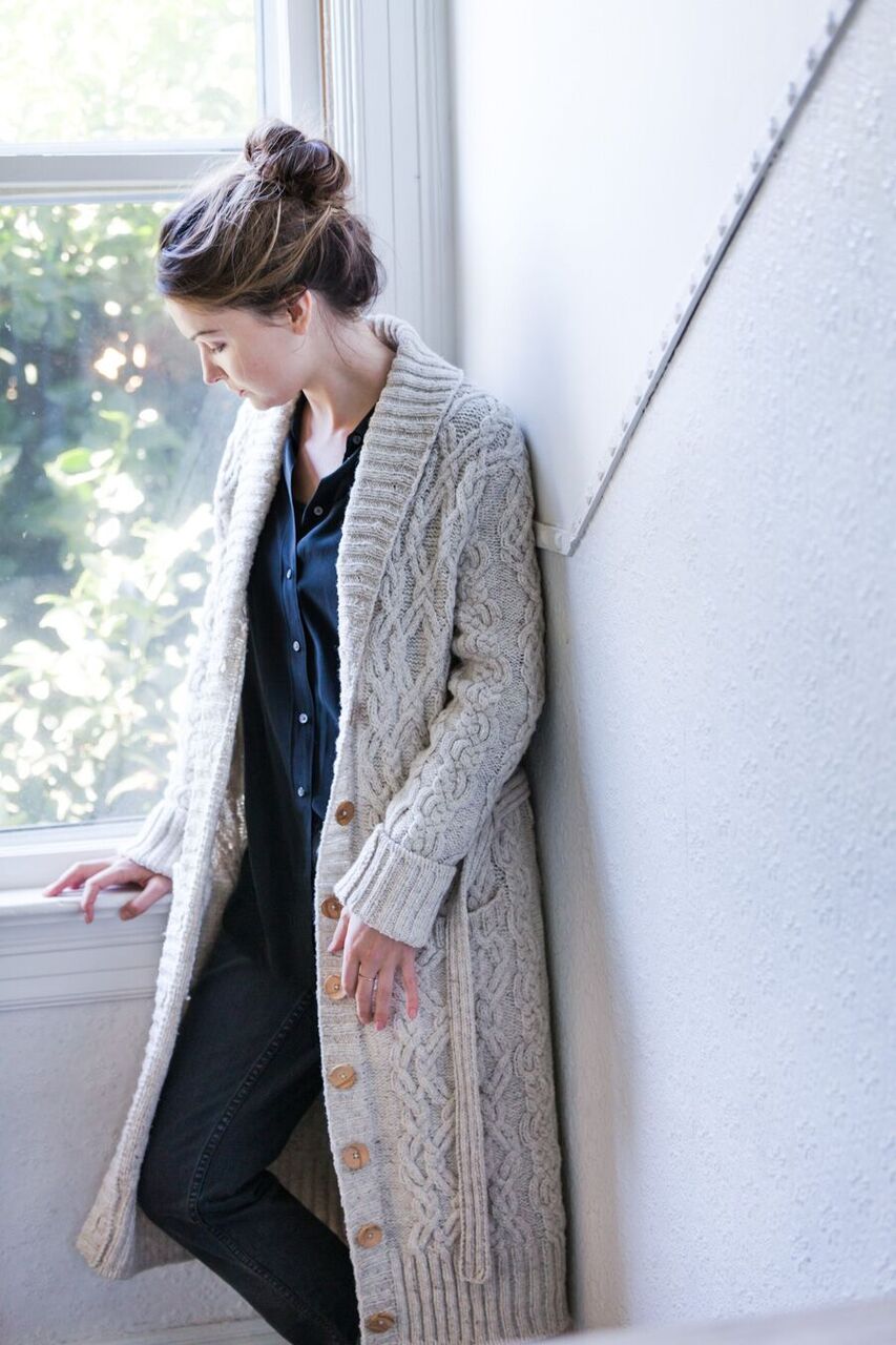 When designing the collection, Michele considered the concept of what handknits mean to her – the embodiment of comfort, both for body and mind. From “quintessential loungewear centerpiece” Aspen and men’s companion design Radmere, to jauntily pom-pom bedecked Cleridae, each piece offers coziness and warmth. Shawl collars and cables abound in Shelter, Loft, and Quarry.