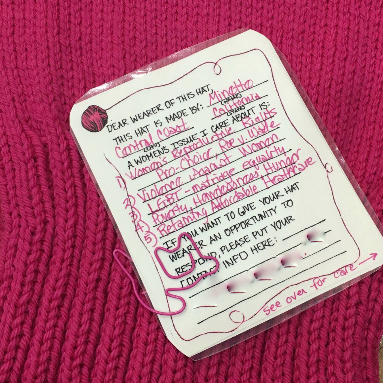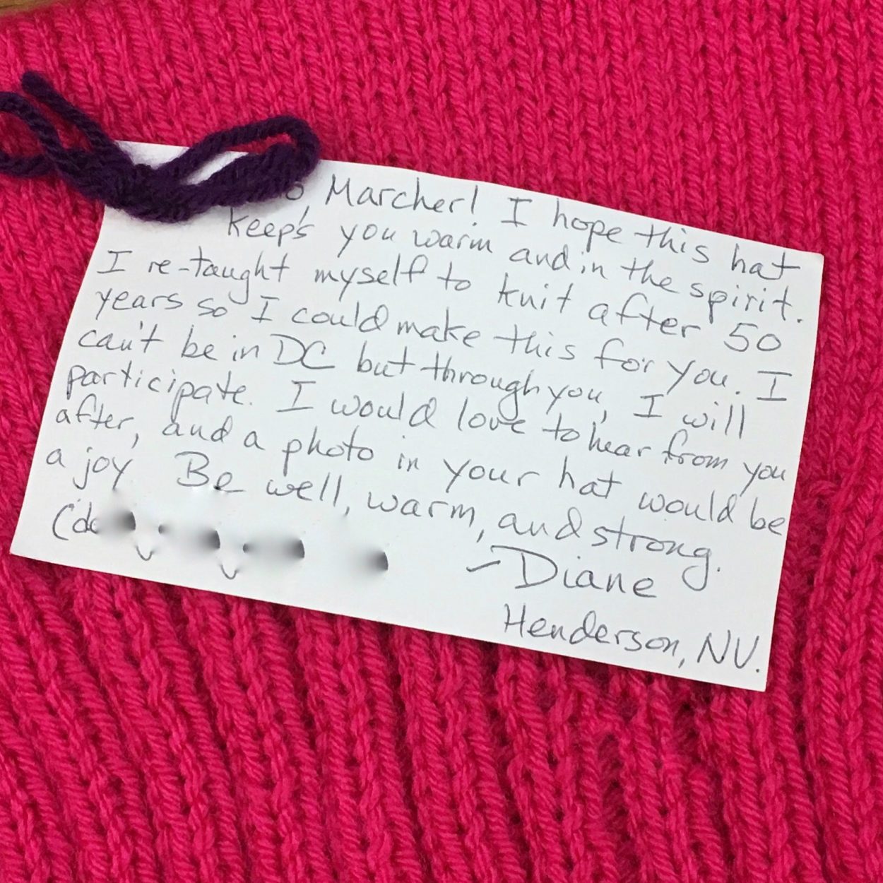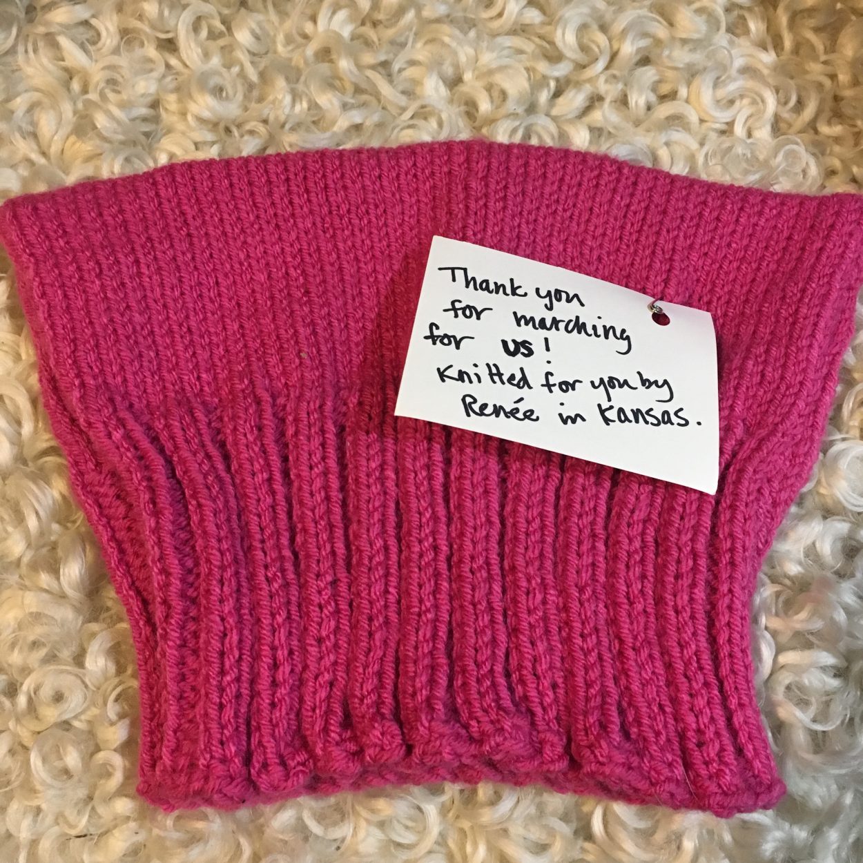 And then the hats showed up..bags and bags of hats from around the world. Literally AROUND THE WORLD. Each one was sealed in a bag with a note from the maker. The notes told the recipient why they made the hat. They wished them safety and warmth during the march. They stated what they were concerned about or what human right they wanted protected. They had emails and phone numbers, so that the recipient could send back a photo of them wearing the hat. I was moved. It was incredible. And then I realized that the project wasn’t simply about putting pink on heads during a march. It was about connecting the makers who could not march with those that were able to. They could be part of it without being present. So thank you to the organizers of this project and a big thank you to those that pushed me to support it. I’m here for your next community effort too. The stitcher community is a large and powerful thing, and I am humbled to be part of it.