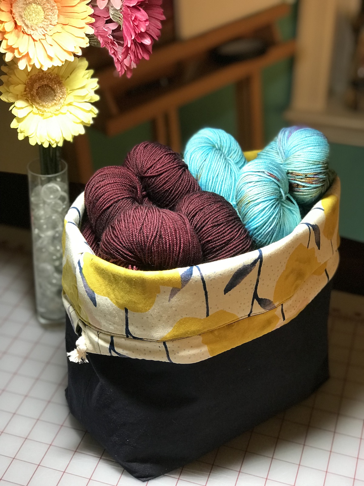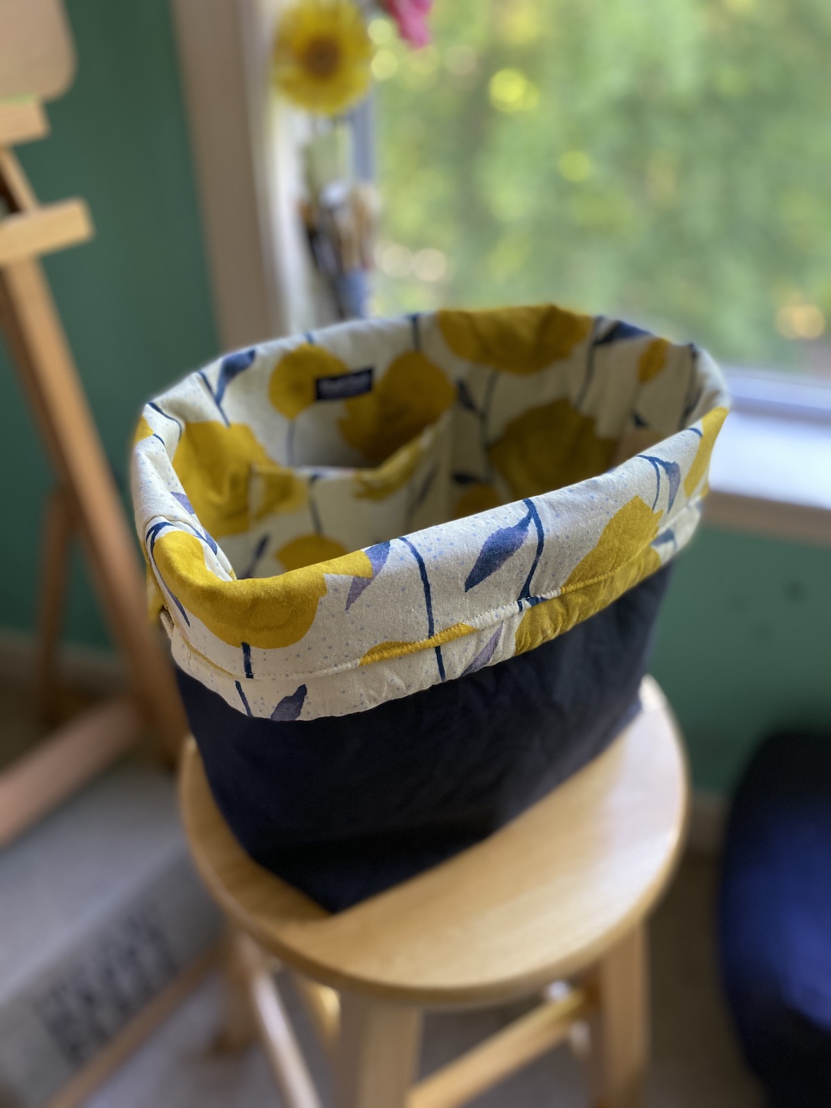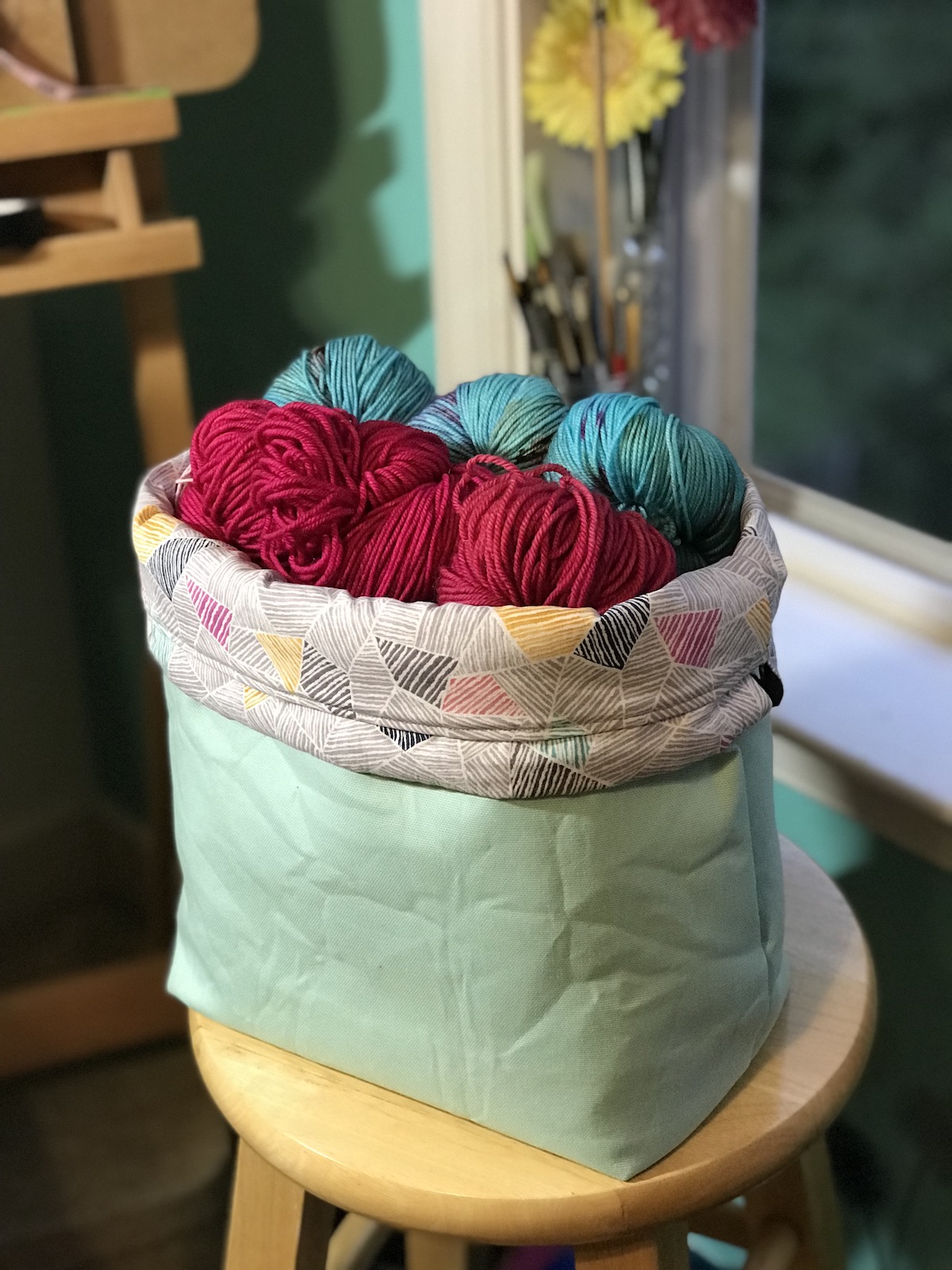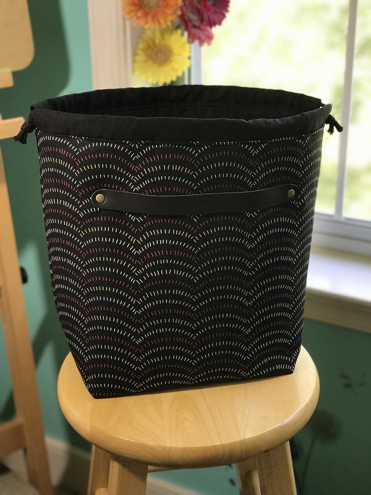 This project bag can carry a large sweater project or even a blanket. Dimensions: 12.25″ tall, 14.5″ wide and 5.5″ deep. It features a riveted 9″ handle, inside pocke and the top folds down to create a fabric yarn bowl. $65-75