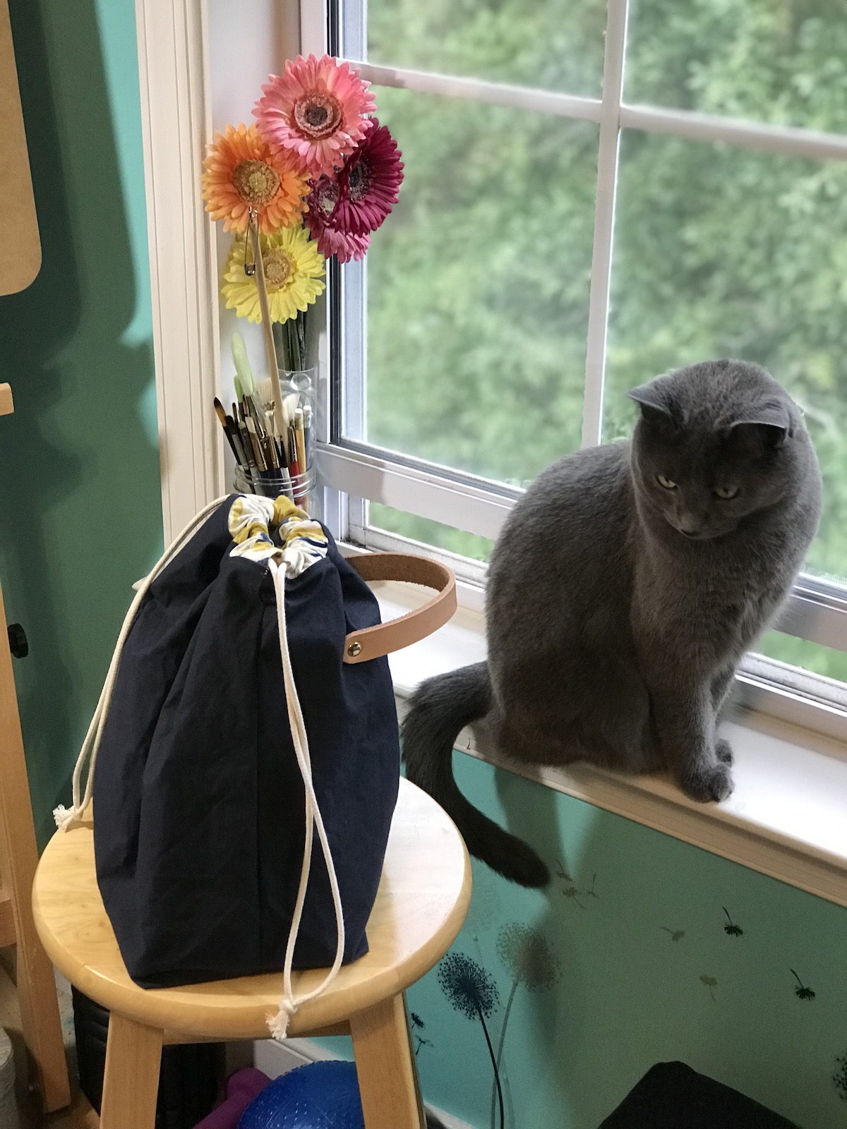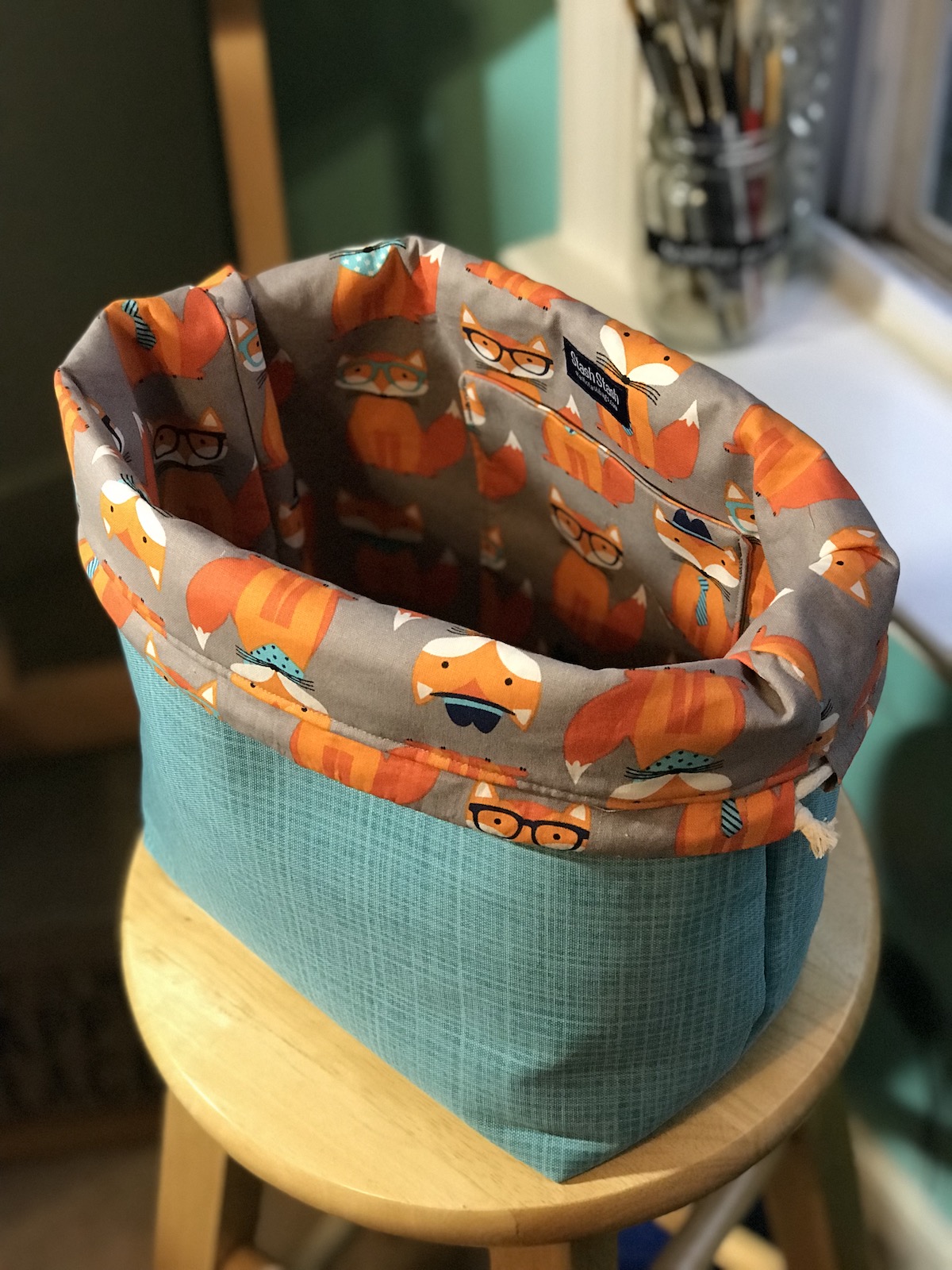 This stand up bag has a trusty removable 6” fabric handle that lets you work while you walk, create while you gait, and frog while you jog. Dimensions: 9.75” tall, 11.75” wide, 3.5” deep $35-36.