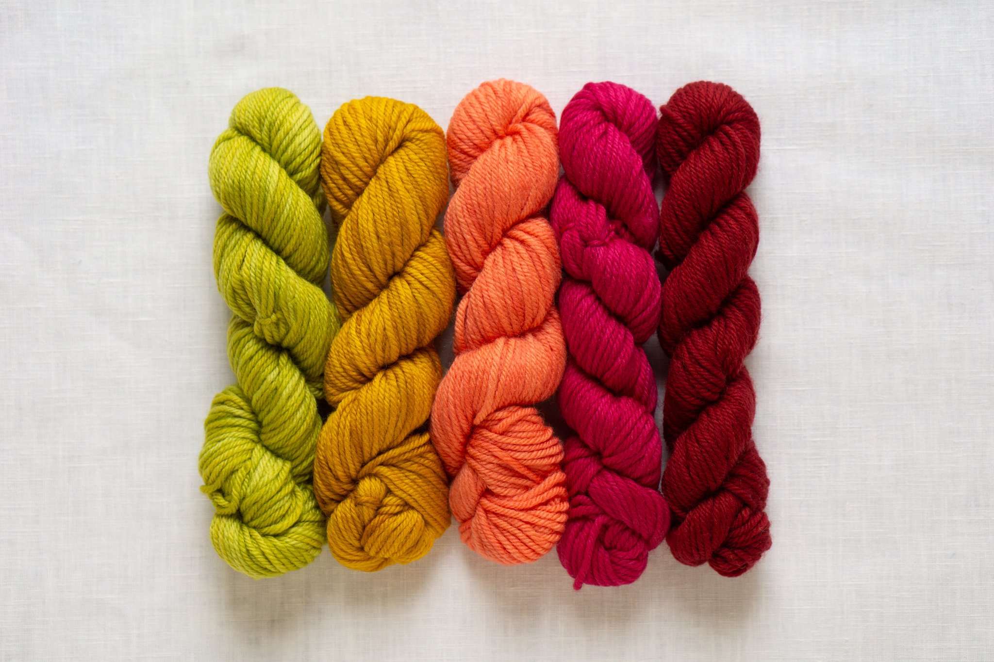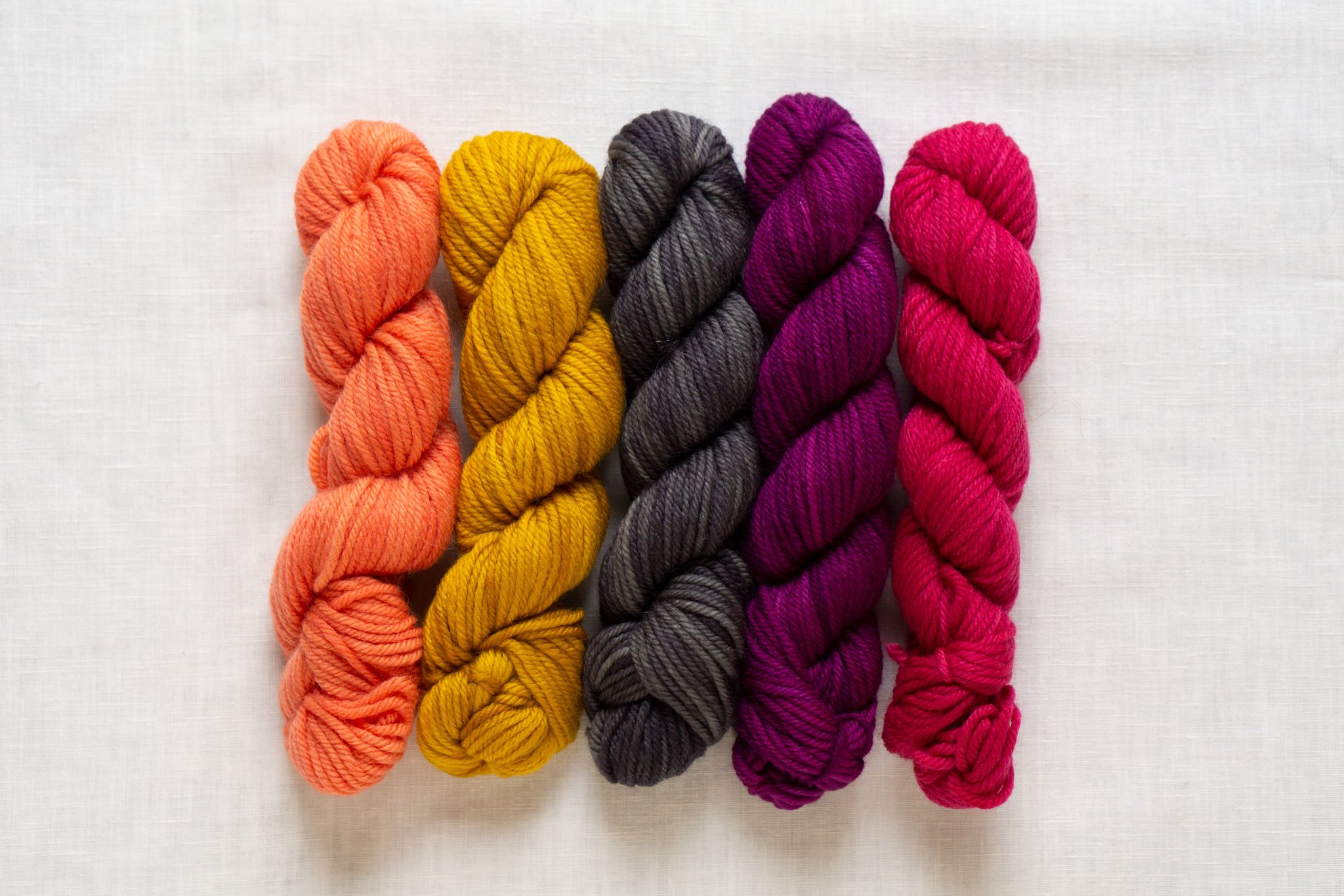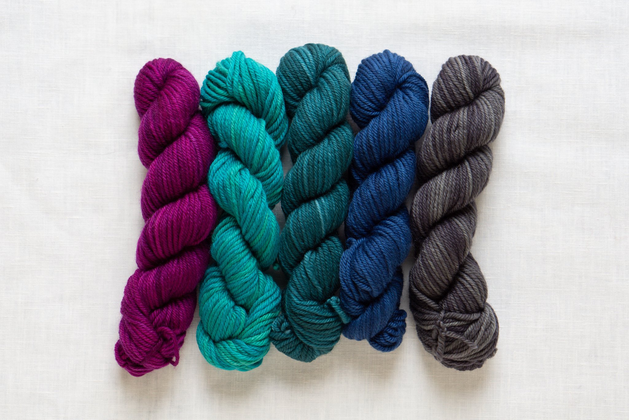 Calling all color lovers! The Dovetail Sweater by Quinn Reverendo lets you explore gorgeous color combinations. Choose a solid color of Alegria Grande, then have fun putting together your five favorite colors for the eye-catching yoke. This design uses “Bocados”, which are 49 yard mini skeins of Alegria Grande. With a palette of ten colors to choose from, you can find the perfect color combination to personalize your Dovetail sweater! Shown in Kohl (MC) with Cactus Flower (A), Tahiti (B), Oceano (C), Turmeric (D), and Teal (E).