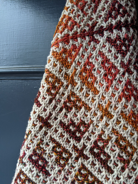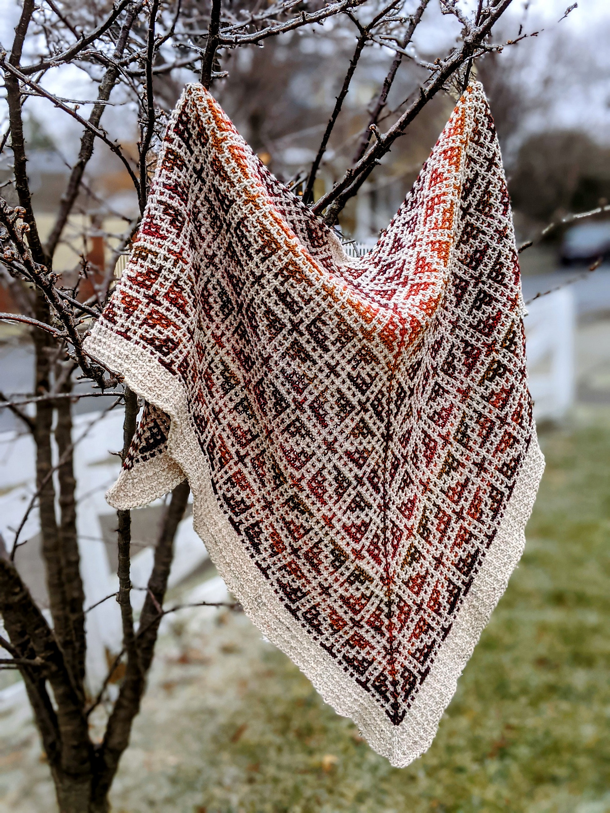 “This was such an enjoyable knit! I loved watching the colors of the Dream State change as the mosaic design developed. This pattern has so many little details that make a polished finish knit – the cord edge, the perfectly mirrored mosaic design, and the textured border. Nightshades and Daylights are some of my favorite yarns for shawls and garments. The cormo wool makes a strong, sturdy fabric that is lightweight to wear. I’ll be living in my finished shawl during these cold temperatures!”