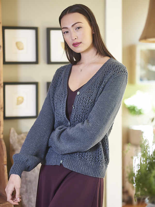 This cozy cardigan features a simple lace motif on the front, and a diamond lace panel on the back! This is a free pattern download!