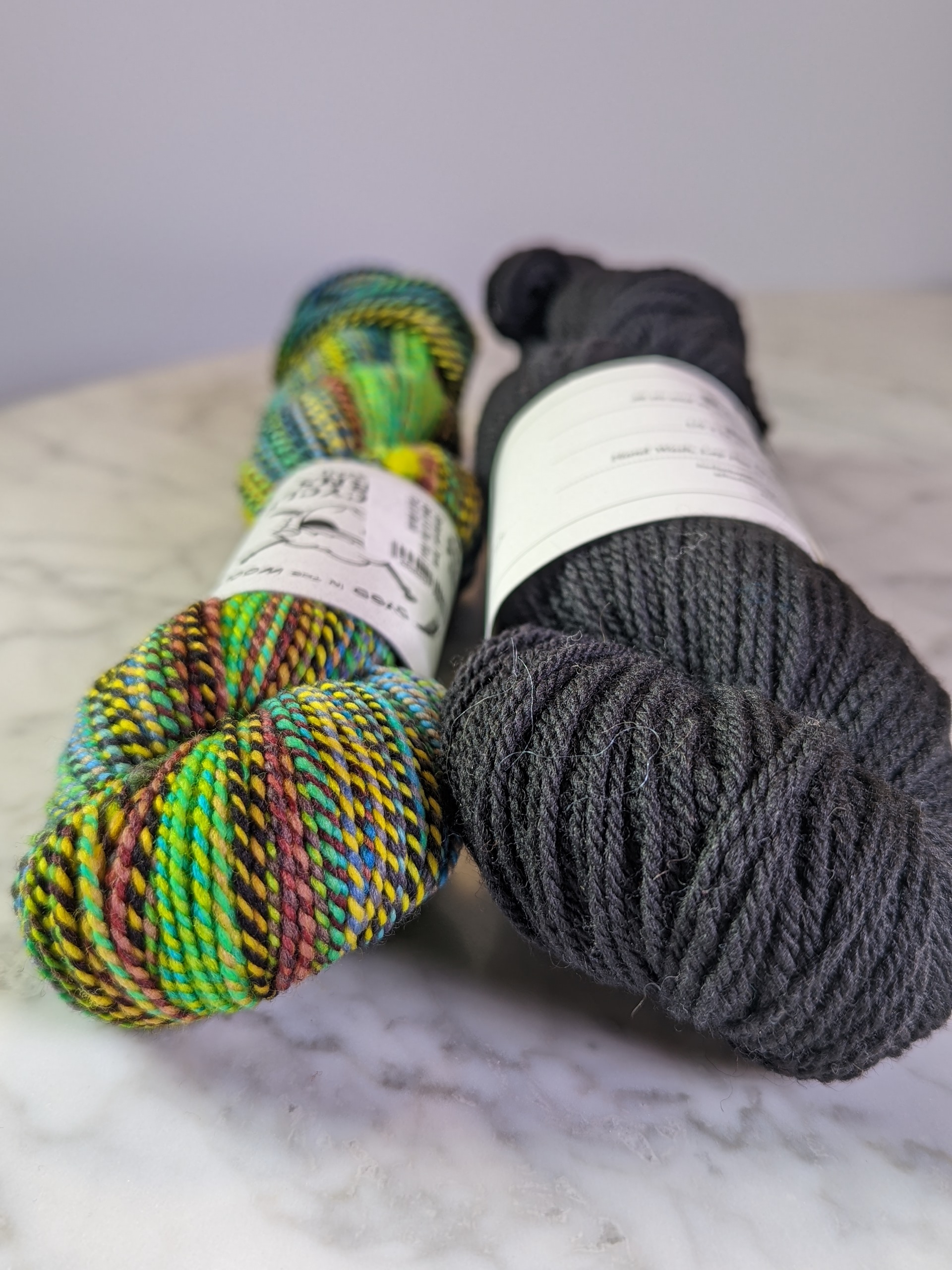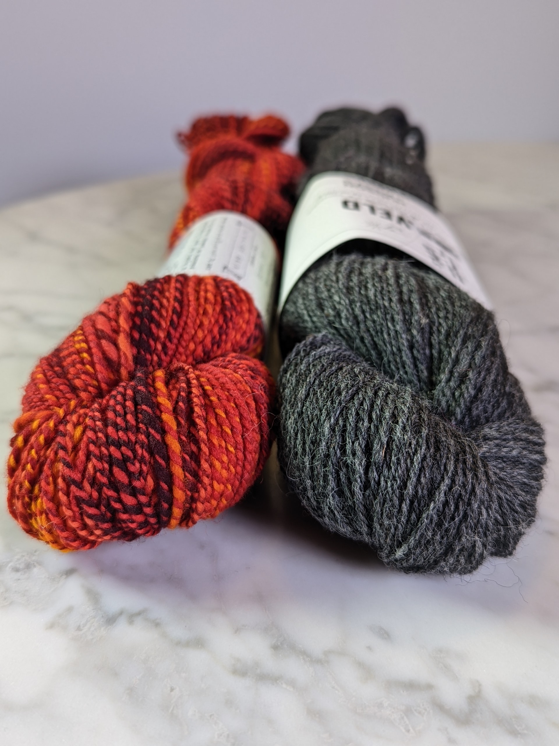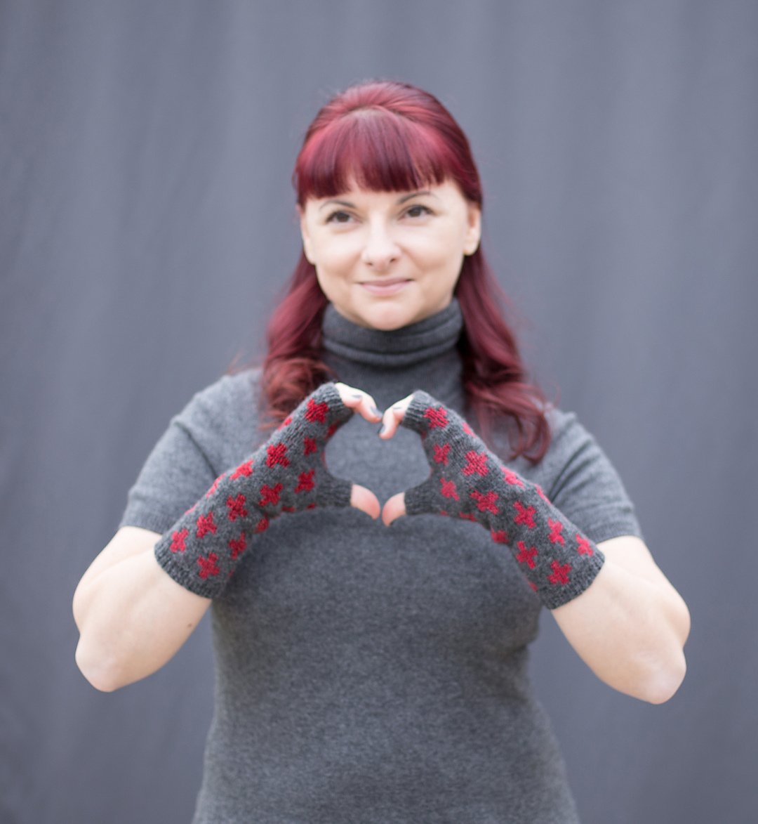 Just one skein of each yarn is needed to make the pair of mitts. You can find both yarns in shop or on our website. Our yarnistas pulled some of their favorite color combos, and are always happy to help you pick your own! We have the combination that Olga used (Spincycle Dyed in the Wool “Devilish Grin” and Hudson and West Weld “Charcoal.”