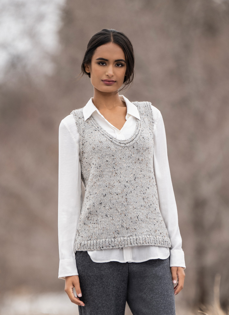 Inspiration was pulled from the original Woolstok palette, and the colors are inspired by the natural landscape. The fourteen colors of Woolstok Tweed are earthy with neutral flecks and offer endless color combinations to suit every taste. Made from a blend of 85% Fine Highland Wool and 15% Donegal, Woolstok Tweed has an overall muted tone with accents of speckled texture due to the delicate Donegal neps. This versatile yarn is available in 100g/100m hanks and is excellent for larger needle projects, garments, accessories and home décor.”