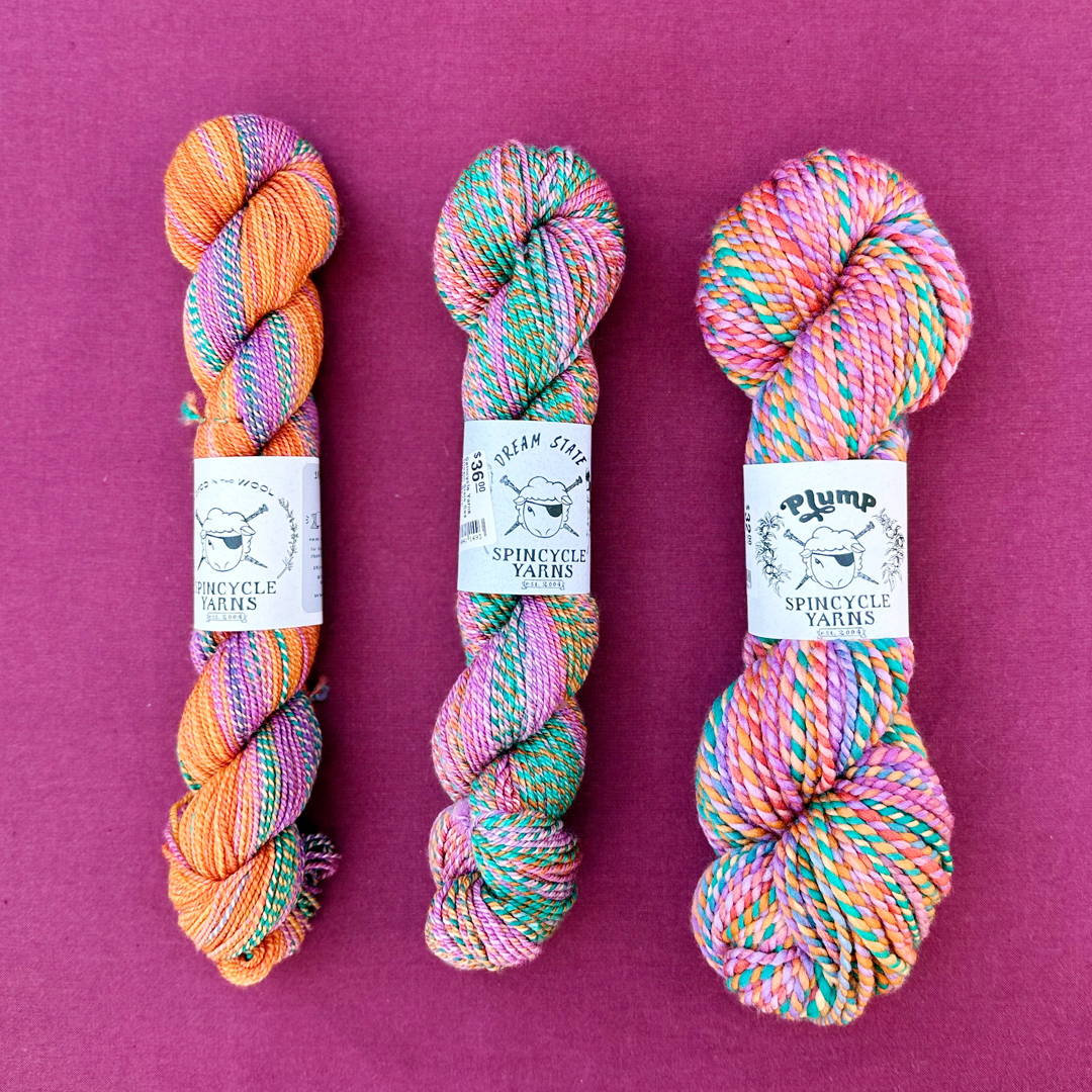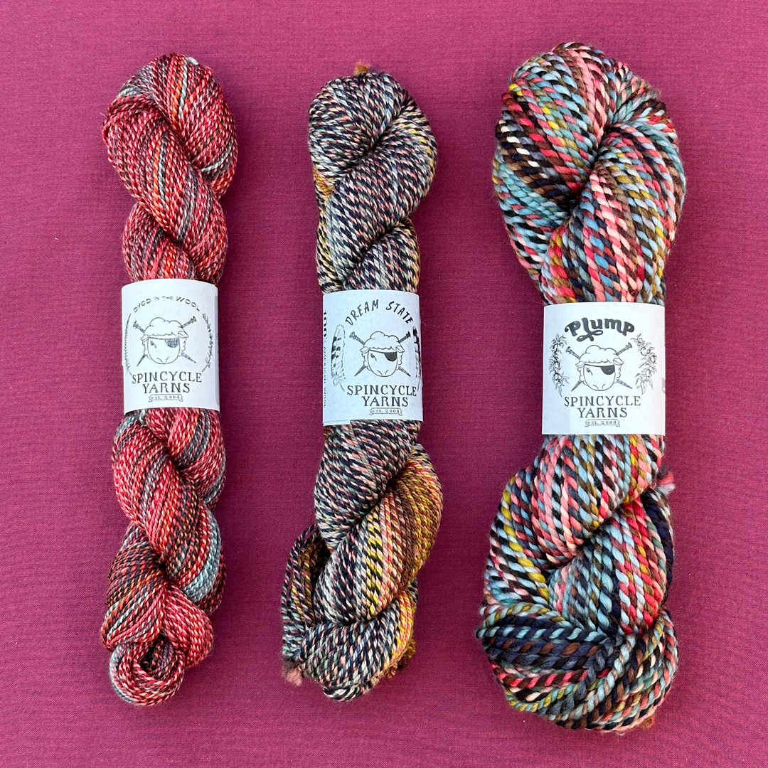Here’s a bit of a look at plump along with it’s skinnier sister yarns, Dream State and Dyed in the Wool: