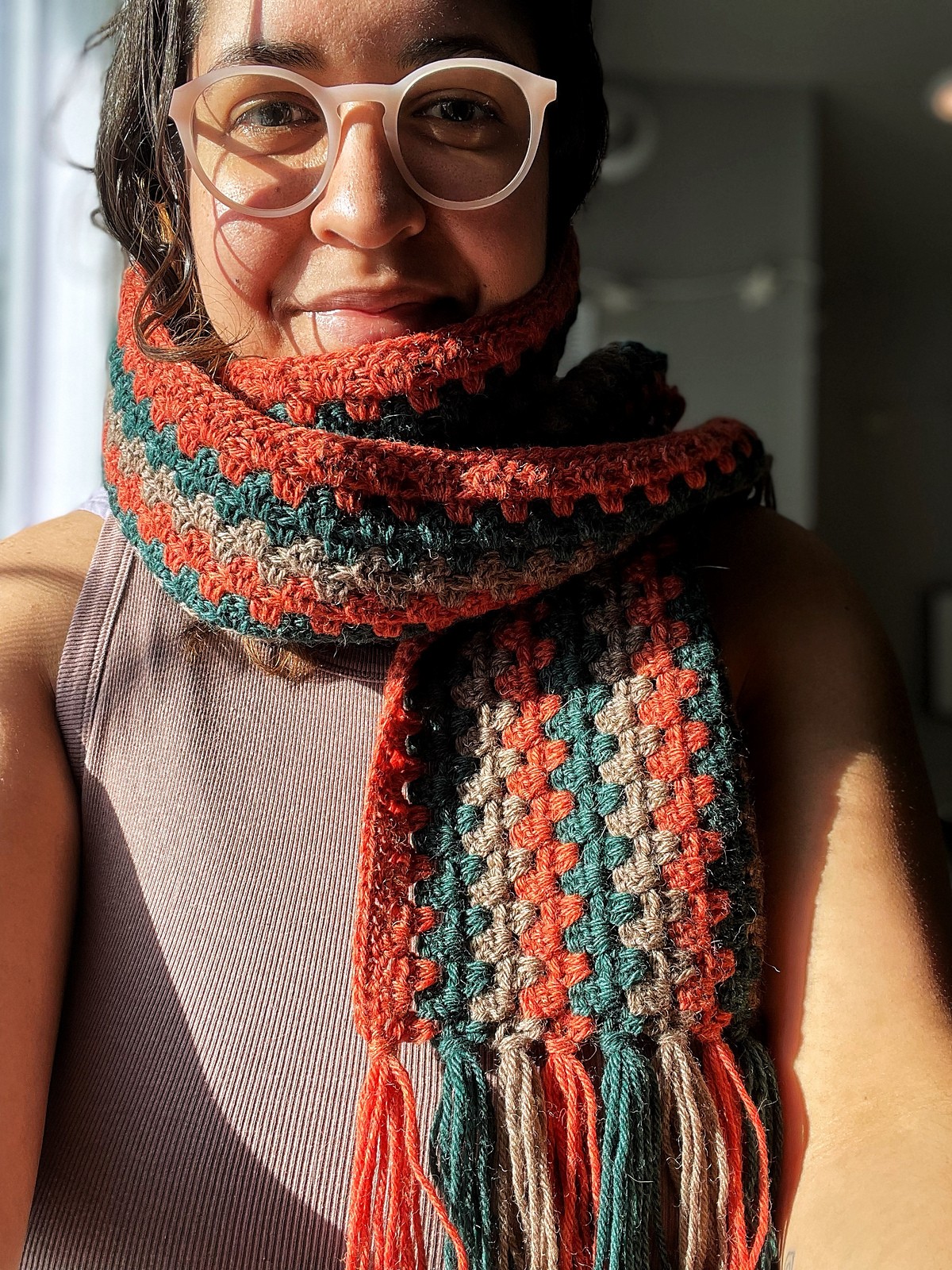 600 – 660 yards total of worsted-weight yarn, or 200-220 yards per color, slightly less if you are not interested in adding the fringe.