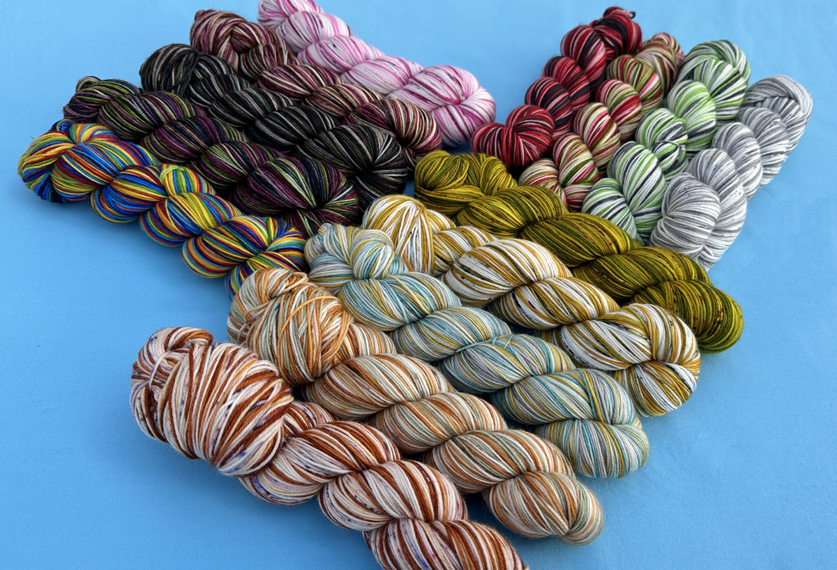 Bisous, fibre fans! One of our favorite hand-dyed yarns for holiday projects is back in space from Quebec, Canada’s own Biscotte Yarns–that’s right, it’s Bis-Sock!