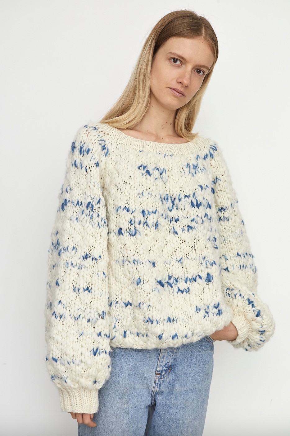 This sweater starts with our newest yarn from KINUA: The Flamé. The Flamé is a super bulky hand-spun yarn. The irregular thickness of the yarn results in a lofty and light fabric with a unique texture. The hand-dyed threads of color will weave in and out of your stitches, sprinkling modern pops of colors throughout the sweater. Then, using the Aran-weight KINUA The Skinny at the cuff, collar and hem will structure the edges of the sweater, balancing the thick-and-thin fibres of The Flamé.