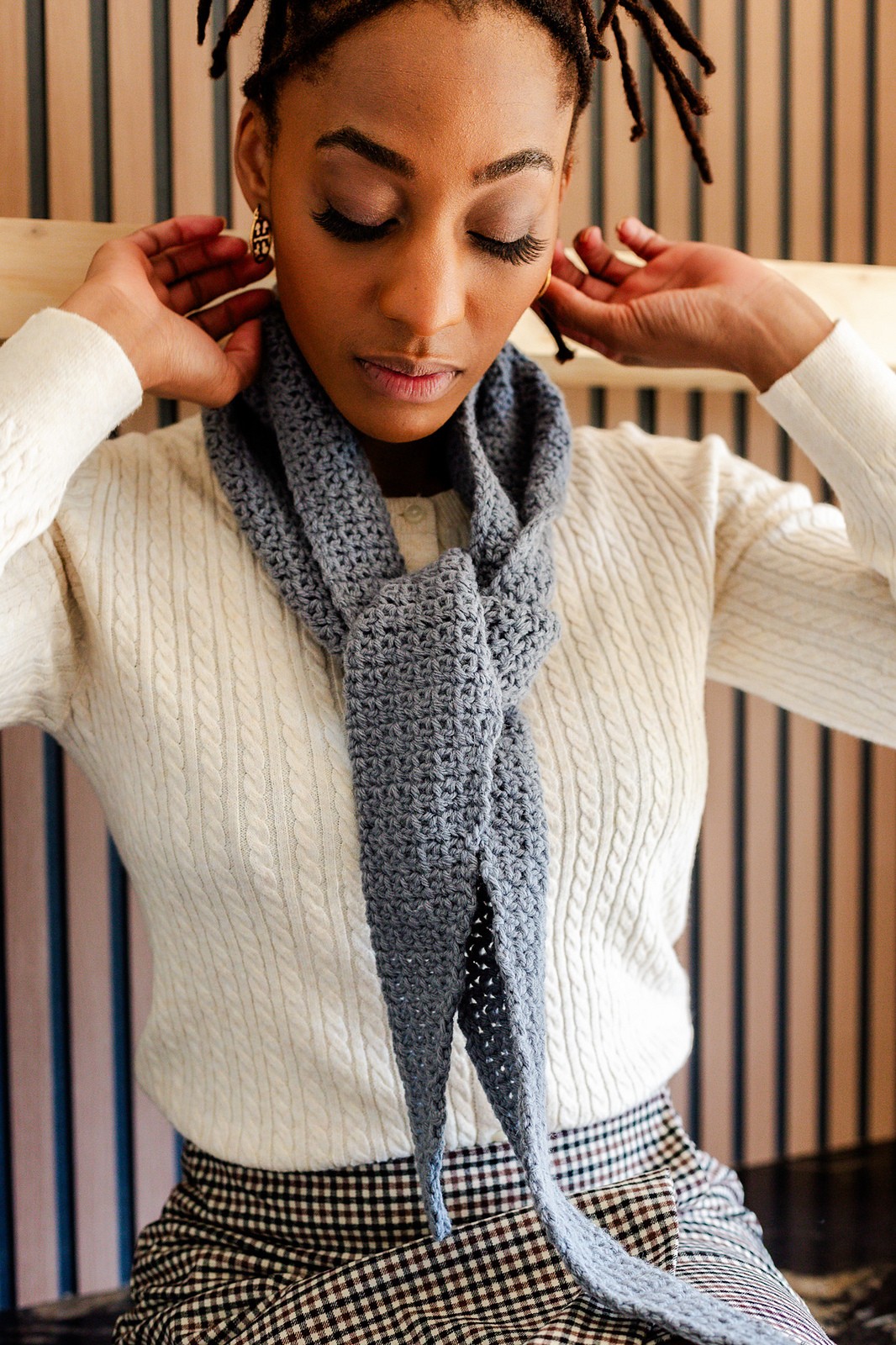 - Kerchief: 45″ x 5″, scarf: 60″ x 8.5″, shawl: 85″ x 11″