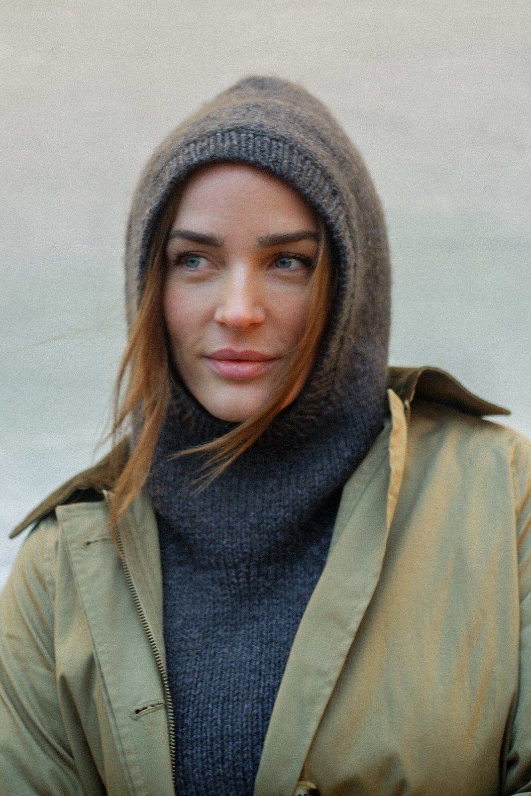 I love the versatility of this pattern! You can cover your head or just use it as a warm cowl. It knits up in quickly in a worsted weight yarn held with mohair, and feels like a super luxurious gift. Squishy and cozy, I love mixing and matching the Knitting for Olive Heavy Merino with Soft Silk Mohair creating new color combos! Knitting for Olive has some great swatch videos on their Instagram to help you see how different colors of Soft Silk Mohair look when held double with Heavy Merino, too. –Danielle