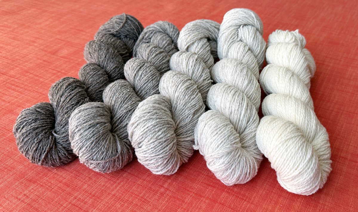 C1, C2, C3, C4, C5: 1 skein each WoolDreamers 90 Varas (100% transhumant Merino wool, 246 yards/225 meters per 50-g skein).