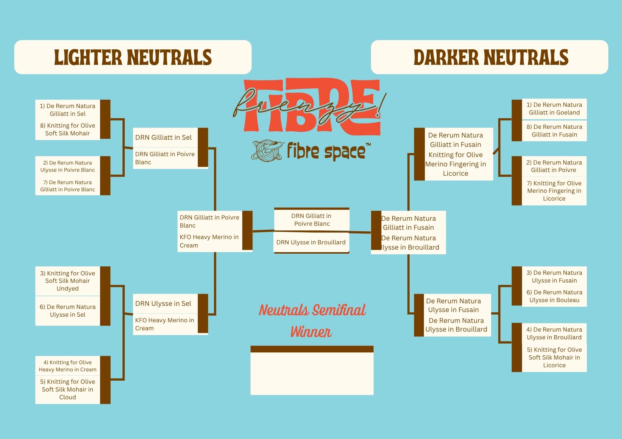 Fibre friends, we’ve got this narrowed to the Darker Neutrals final. De Rerum Natura Gillatt in Fusain won its match against a much lighter gray in De Rerum Natura Goeland with a solid lead. And, De Rerum Ulysse in Brouillard beat Knitting for Olive Merino in Fingering in Licorice decisively. A deep charcoal gray worsted weight against a lighter gray sportweight? Get your votes in and let’s see which gray is victorious!