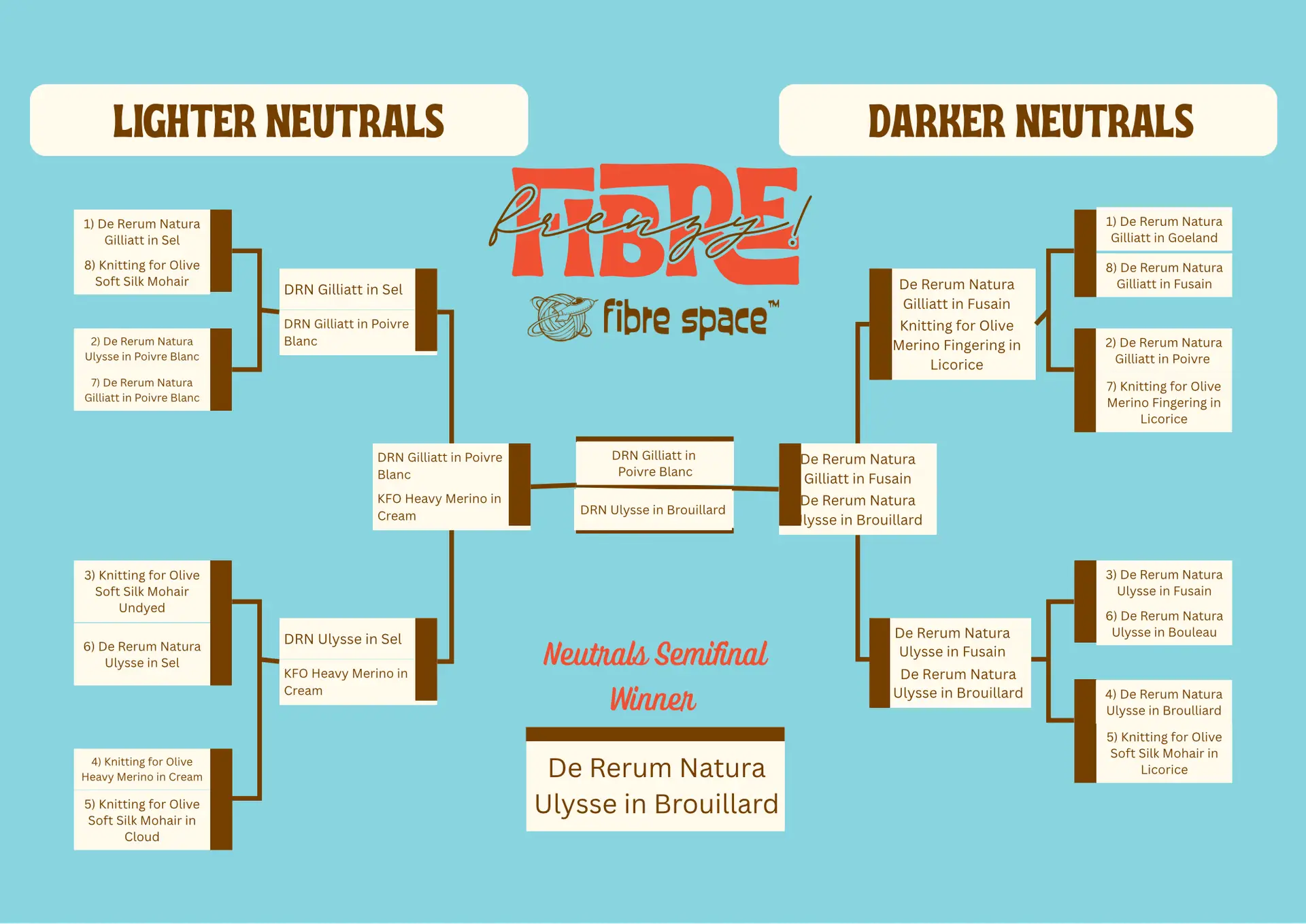 Fibre friends, we’ve got this narrowed to the Darker Neutrals final. De Rerum Natura Gillatt in Fusain won its match against a much lighter gray in De Rerum Natura Goeland with a solid lead. And, De Rerum Ulysse in Brouillard beat Knitting for Olive Merino in Fingering in Licorice decisively. A deep charcoal gray worsted weight against a lighter gray sportweight? Get your votes in and let’s see which gray is victorious!